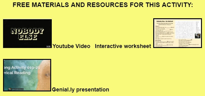This song-based STEP-BY-STEP LESSON PLAN for ENGLISH language TEACHING features the lyrics and music video for “NOBODY ELSE” by EM BEIHOLD. Students TALK about pictures, LISTEN to the song lyrics being read, SPECULATE about the song and its meaning, WORK with the lyrics with a word search exercise and DO a listening exercise with an interactive worksheet.