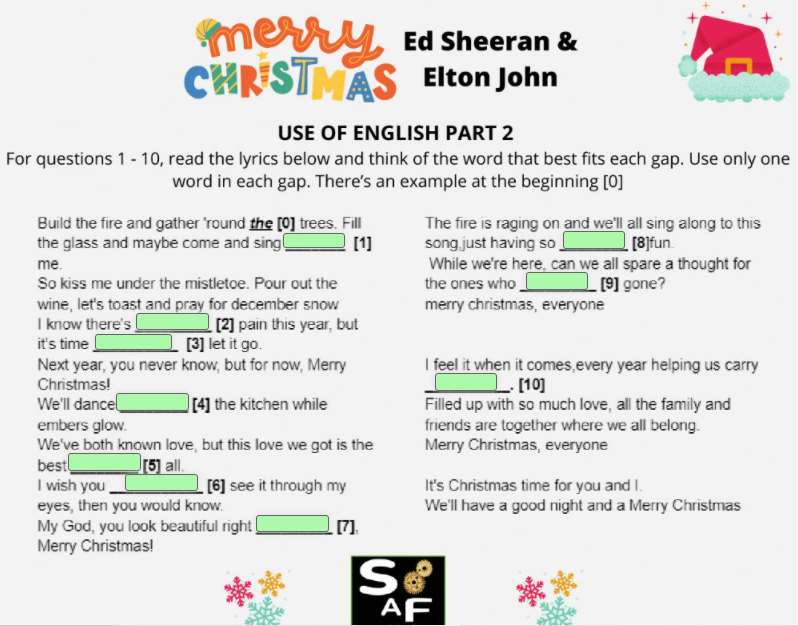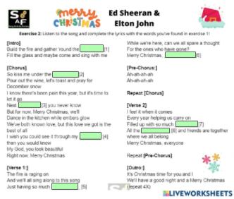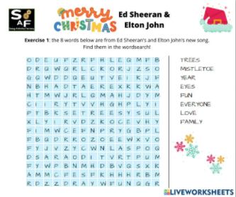This song-based STEP-BY-STEP LESSON PLAN for ENGLISH language TEACHING features Merry Christmas by Ed Sheeran & Elton John. Students TALK about snow angels/snow butterflies, work in pairs to talk about winter themed pictures, PLAY a music video lottery in groups. There are optional exercises for A2 (vowel sounds), B1 (interactive worksheet with word search and listening exercise) and B2 Cambridge English: first (Interactive worksheet: use of English part 2).