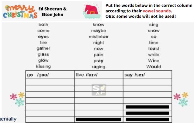 A2 – VOWEL SOUNDS exercise with words from the lyrics (SLIDE 6 in the genially presentation)