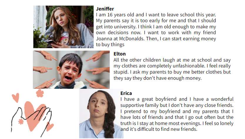 It can also be done as homework. Students write an email to one of the people giving them advice about their situation. About 100 – 120 words. (or 140 – 190 words).