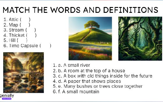 Genially Presentation Slide 2 : attic, map, stream, thicket, hill, time capsule. Ask students to use one of these words in a sentence.