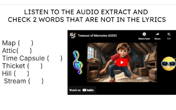 Play the song “Treasures of Memories” Students Listen to the audio extract and check 2 words that are not in the lyrics.