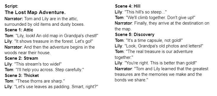 Tom and Lily find a map, / It shows treasure in the forest, how fab! / They follow the map, day by day, / Through streams and thorns, they find a way!